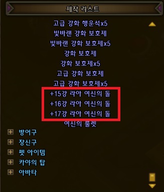 프리미엄 항목에서 +15강 라아 연신의 돌 / +16강 라아 연신의 돌 / +17강 라아 연신의 돌 선택하여 제작